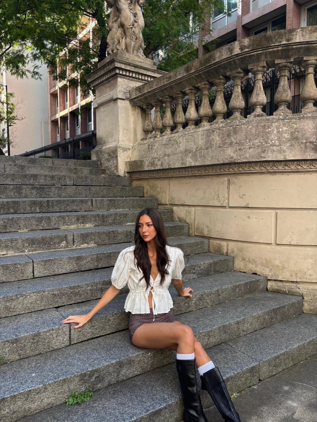 Blusa manga corta escote V. Delantero con botones forrados y puntilla. Cintura fruncida con cordón de la misma tela y volado inferior. Mangas balloon con elástico en puños. Confeccionada en broderie.