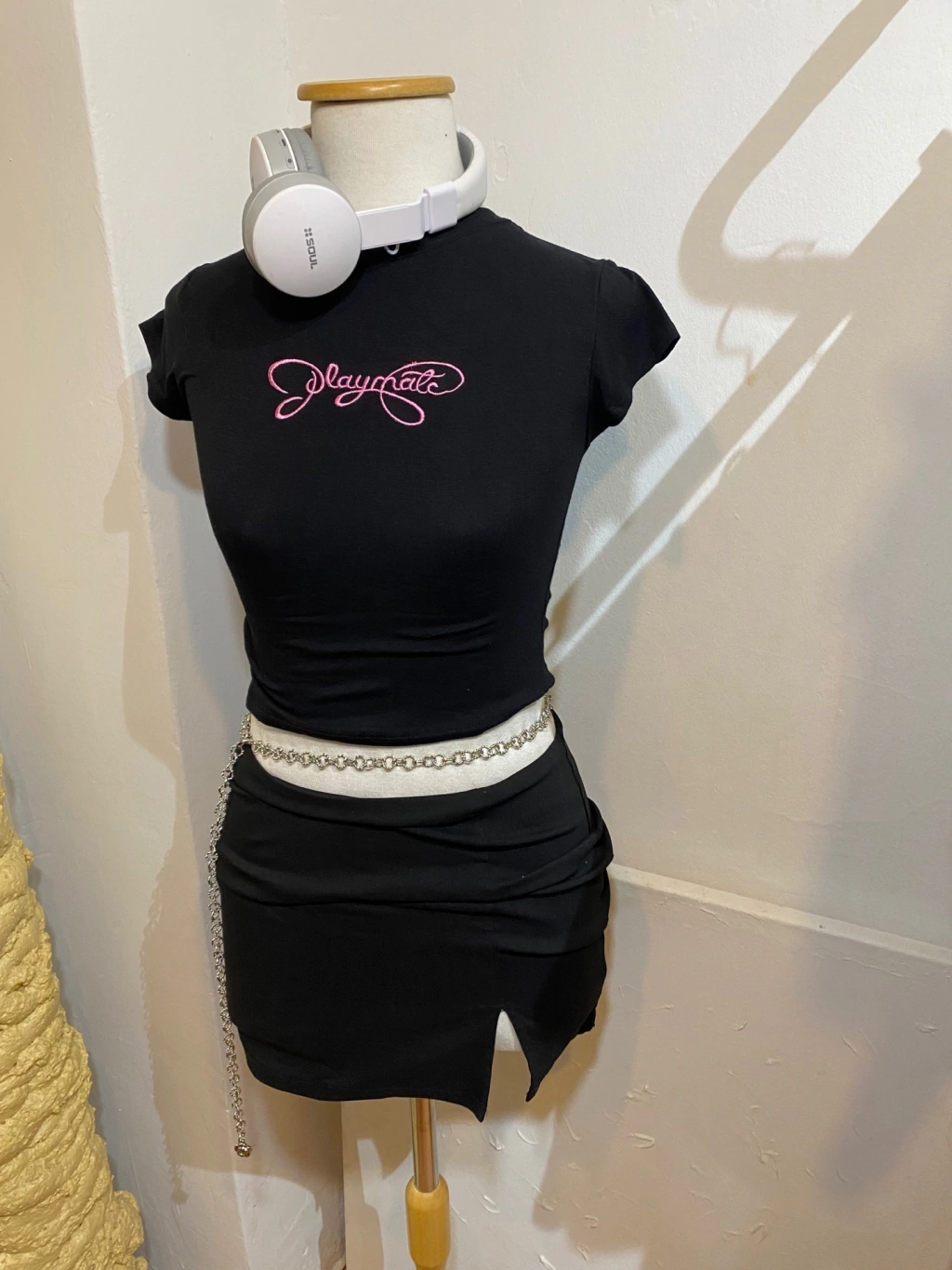 La modelo de las fotos de la falda negra, usa un talle S. Se envían a partir del 24/09.